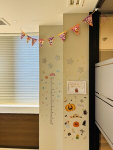 キッズルームにはかぼちゃのウォールシールと フラックの飾りをつけて ちょっぴりワクワクする雰囲気に♪